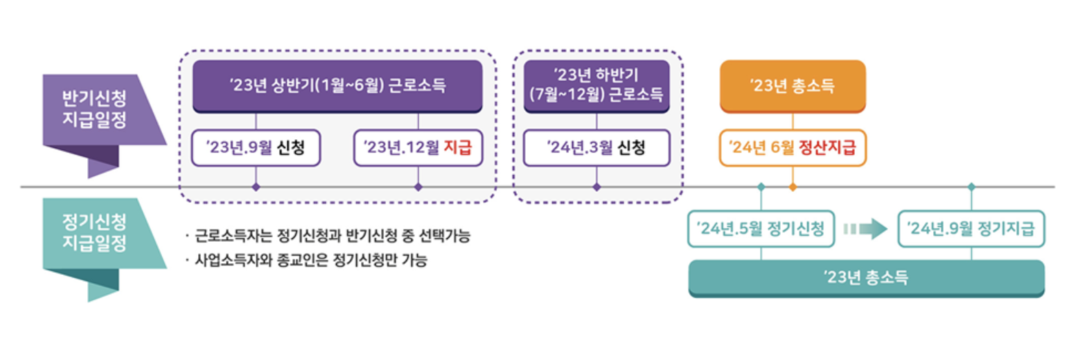 | 정기분 : 5.1 ~ 5.31 | 근로소득, 사업소득, 종교인소득이 있는 거주자로서 신청요건을 충족한 경우 | 5월 신청 : 8월 말 지급 |