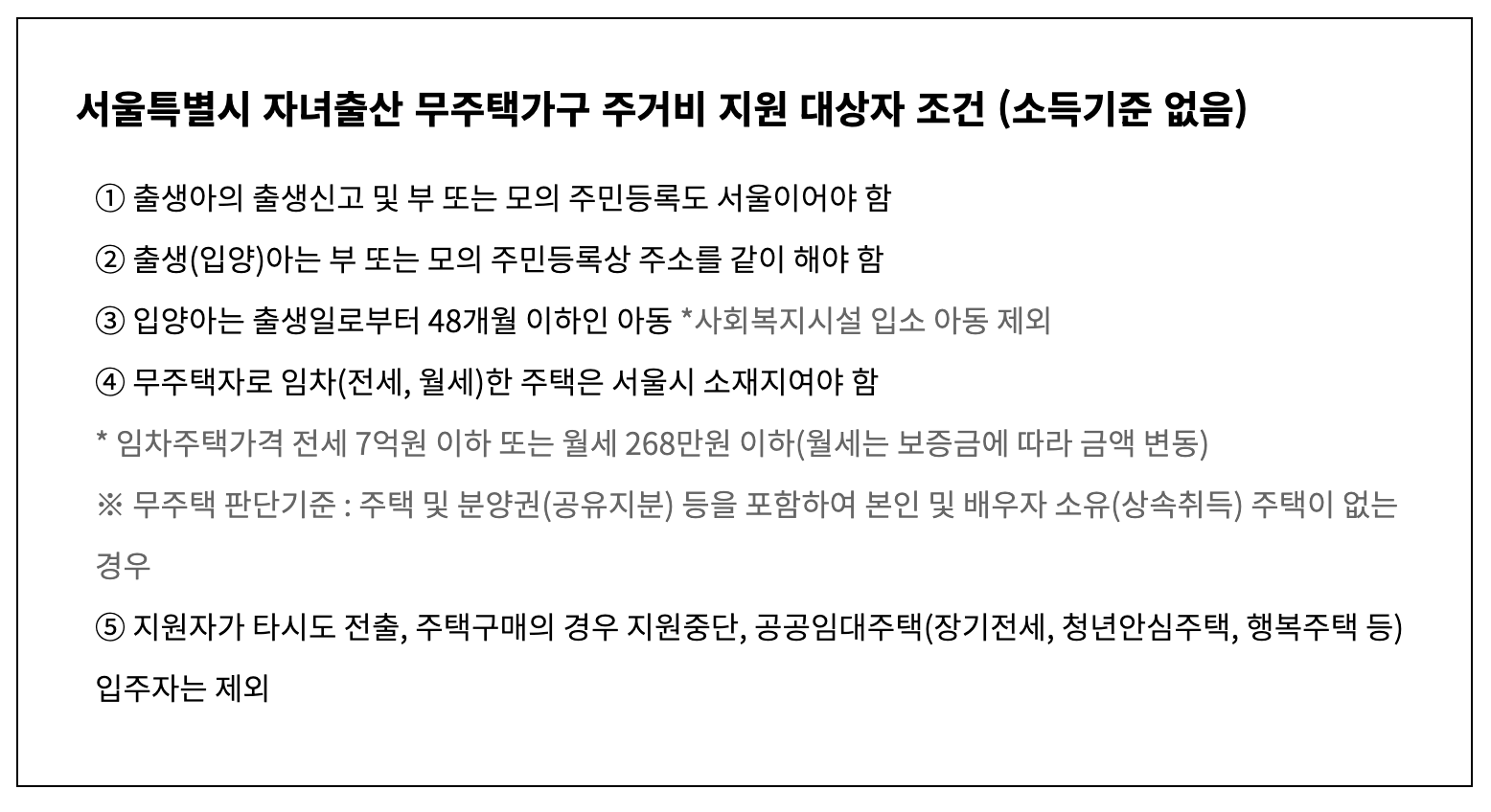 오늘은 이렇게 서울시의 저출산 극복을 위한 제도 중 하나인 ‘자녀 출산 무주택가구 지원금 제도’에 대해 알아보았는데요.